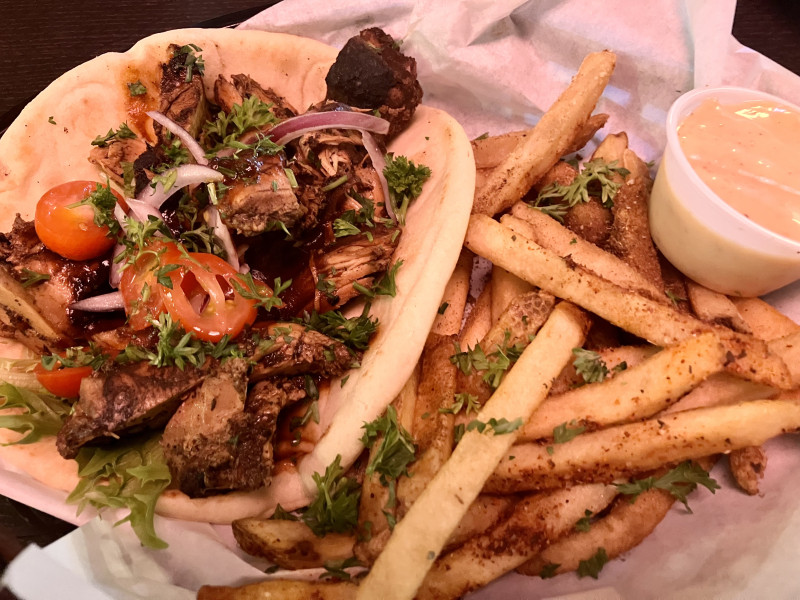 Pic: my dinner from last night. A highly seasoned, grilled chicken in a pita with pomegranate BBQ sauce, and both cumin fries as well as harissa lemon fries. I ate it ALL! The chicken was literally falling apart, and the pita, the PITA! I would like to be buried in that pita and eat my way out!