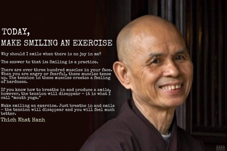 "Why should I smile when there is no joy in me? The answer to that is: Smiling is a practice. There are over three hundred muscles in your face. When you are angry or fearful, these muscles tense up. The tension in these muscles creates a feeling of hardness. If you know how to breathe in and produce a smile, however, the tension will disappear β it is what I call βmouth yoga.β Make smiling an exercise. Just breathe in and smile β the tension will disappear and you will feel much better." (Thich Nat Hanh)
