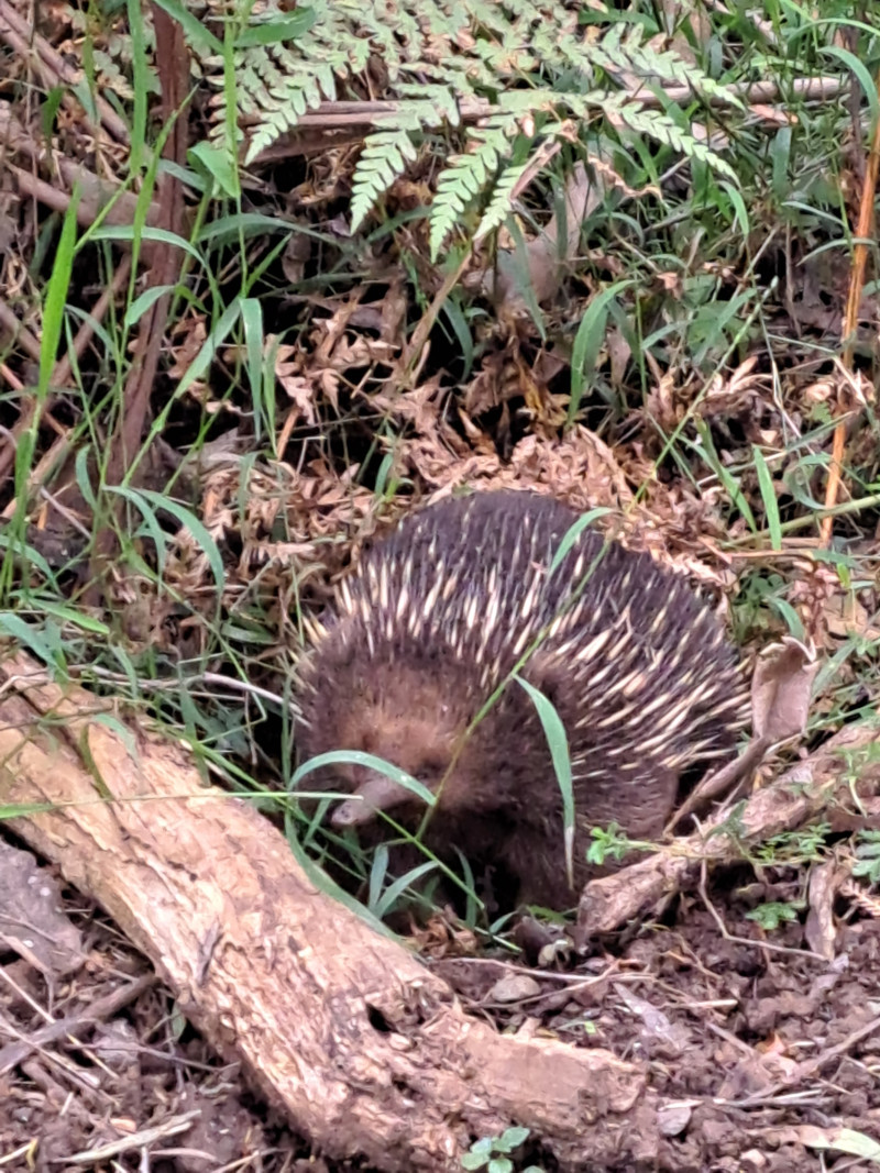 Echidnas are sturdy critters that live on the ground and snuffle around in the dirt and leaf litter looking for tasty grubs. They have a "beak", which is a long snout type thing like an anteater, which they use to plow through the dirt. They have very short but very strong legs that they use to dig, similar to moles. And they are covered in quills, similar to porcupines. The first time I saw one I had gone for a long run and was very tired, and then when the echidna walked out on the path in front of me I thought it was a porcupine. Then I remembered I am in Australia and there are no porcupines here. I had to stop and try and get my brain into gear, figure out where I was...things were very rusty for a minute.