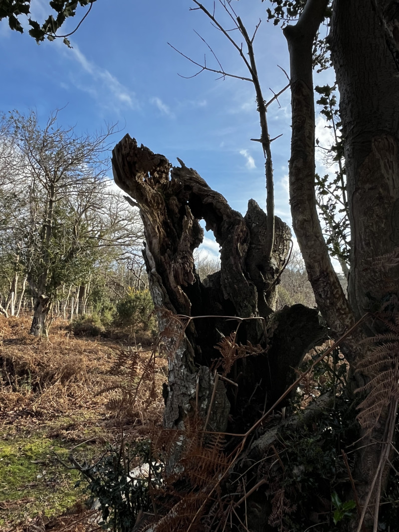 The New Forest in the south of the UK means ancient woodlands, beautiful views and luckily today not much mud. At one point we were walking through Hollywood…. an area with mainly holly trees. Holly trees make my “crazy tree lady”’s heart beat very fast ❤️❤️❤️❤️. The beauty of the gnarled trunks and branches… photo above: holes typical of holly trees. Below some more beauties.