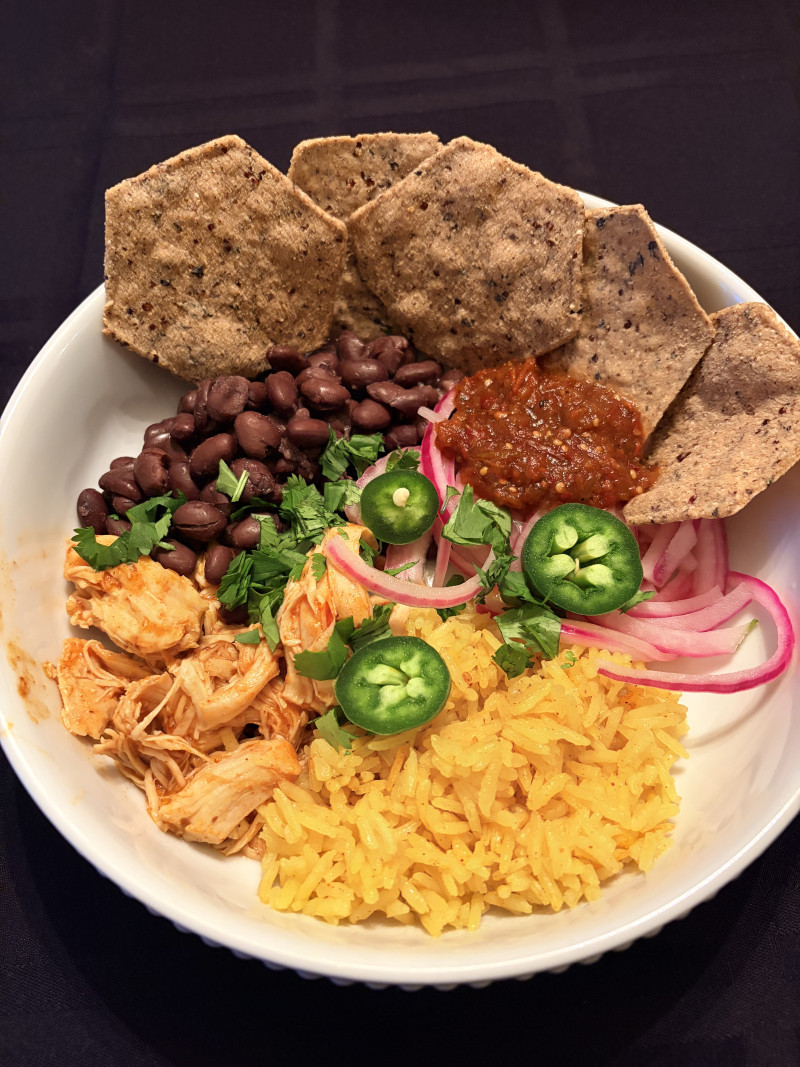 Pic: my dinner last night was pretty, and pretty tasty! Shredded chicken cooked in enchilada sauce; jasmine rice flavored with a bit of chili powder and turmeric; black beans, pickled onions, cilantro, jalapeños, and black bean quinoa chips. Y.u.m.