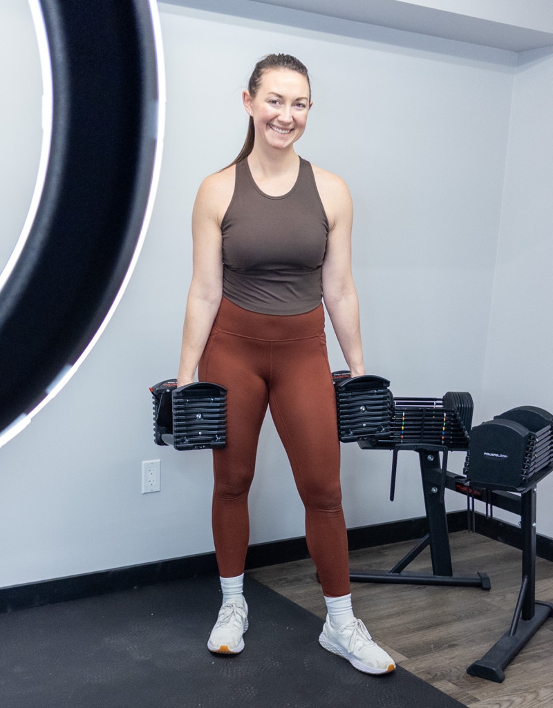 You’ll want moderately-heavy weights (for you), but this workout is easy to scale — lighter weights, slower tempo, smaller range of motion all count. It lands around a 4/5 difficulty, but you’re always in control of the intensity!