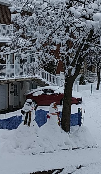 Photo is my neighbor's creation, a snow couple for the delight of passersby. Have a great day!